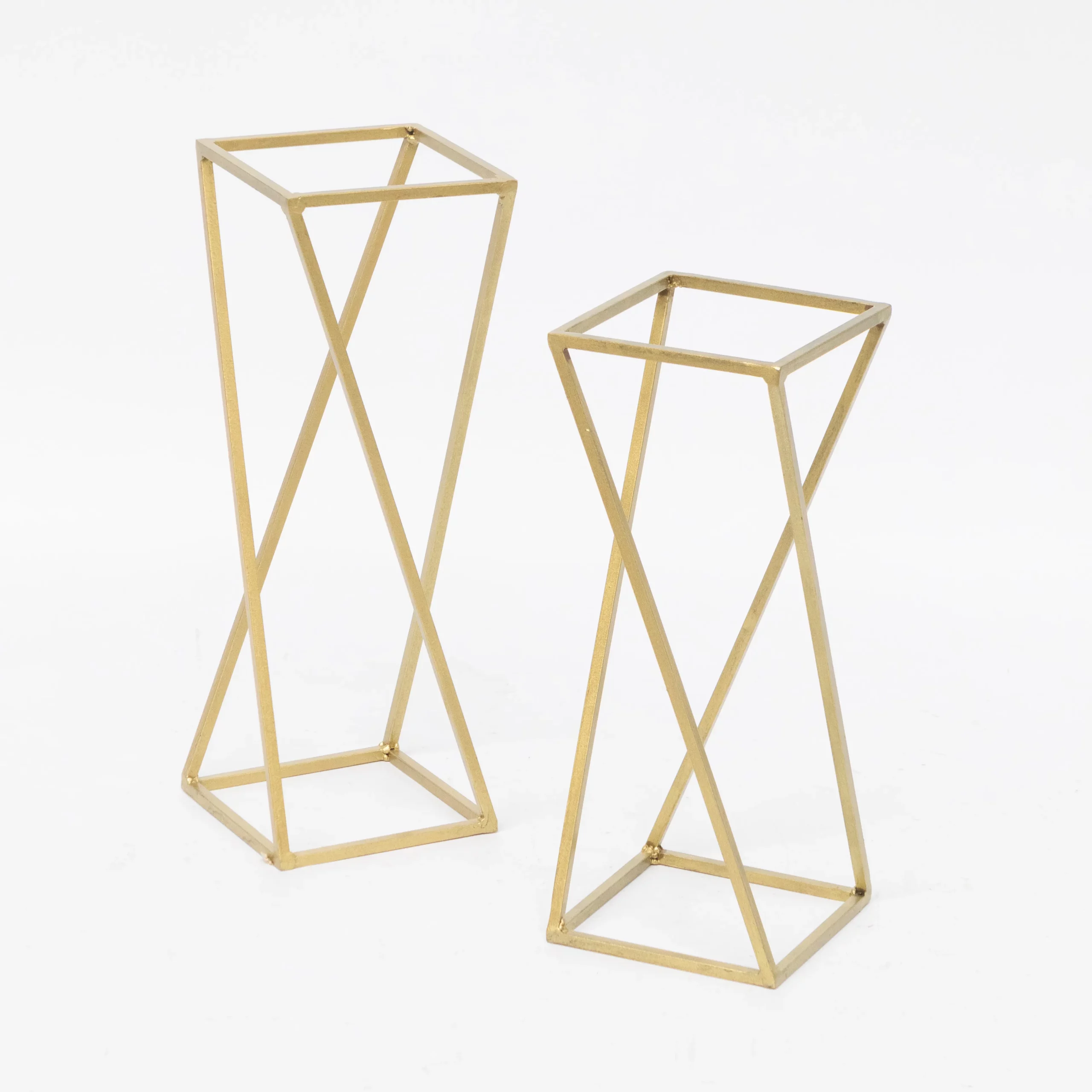 Elegancki Złoty Stojak Geometryczny o wys. 57 cm i podstawie 20 x 20 cm. Na kompozycje kwiatowe, na stoły. Sprawdzi się w stylu glamour czy prestiżowym. Złoty kolor skomponuję się z dowolną aranżacją kolorystyczną. Wypożyczany z drewnianą podkładką (w cenie).